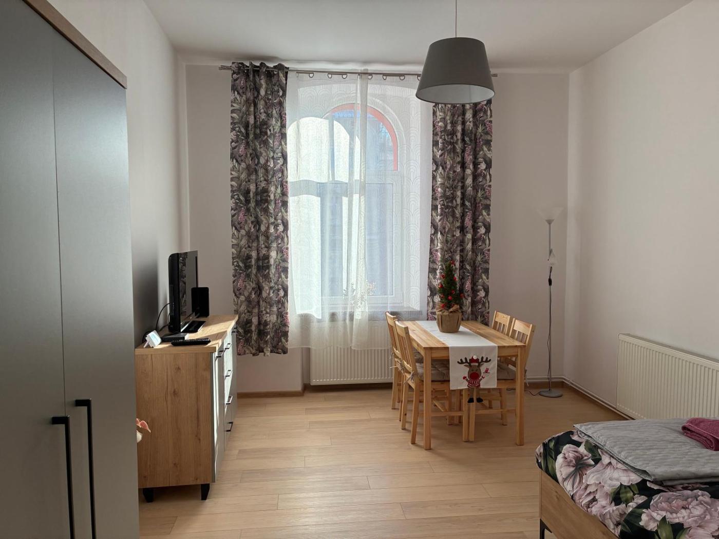 Apartament z 1 sypialnią. Jest to apartament z kuchnią, w której goście mogą przygotowywać posiłki i przechowywać żywność. Udogodnienia w tym apartamencie obejmują ogrzewanie i telewizor z płaskim ekranem. Do dyspozycji gości jest 1 łóżko. Apartament - 2 osobowy. Powierzchnia pokoju ok.: 27 mkw.